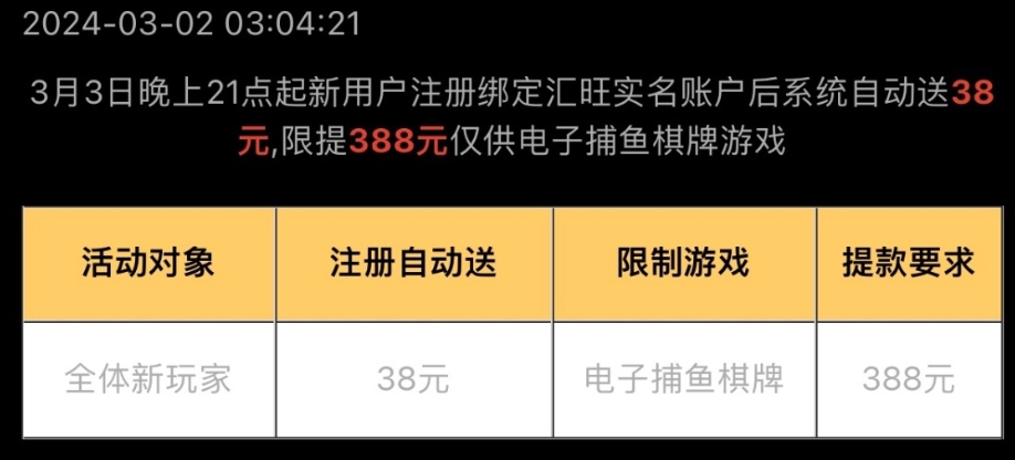 活动详情:新用户注册实名绑定汇旺,系统自动派送38 彩金限制捕鱼,电子,棋牌打到388提款。