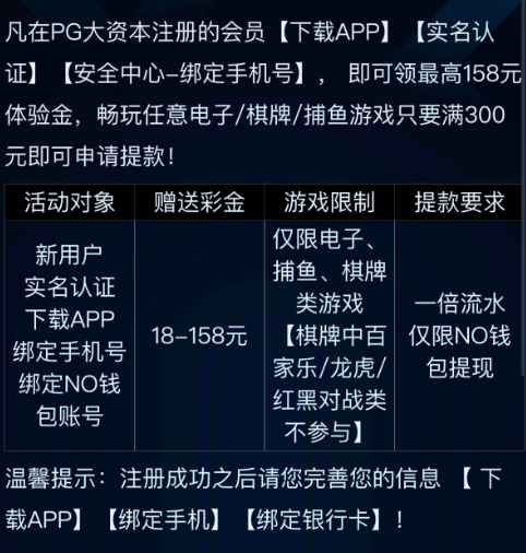 活动详情:新用户注册完善个人信息需要绑定NO钱包之后联系在线客服申请彩金最低18 300起提